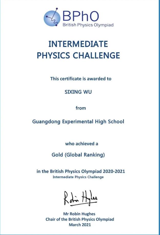 2020年澳大利亚物理奥赛(ASOP)中,吴思行获得全球二等奖。